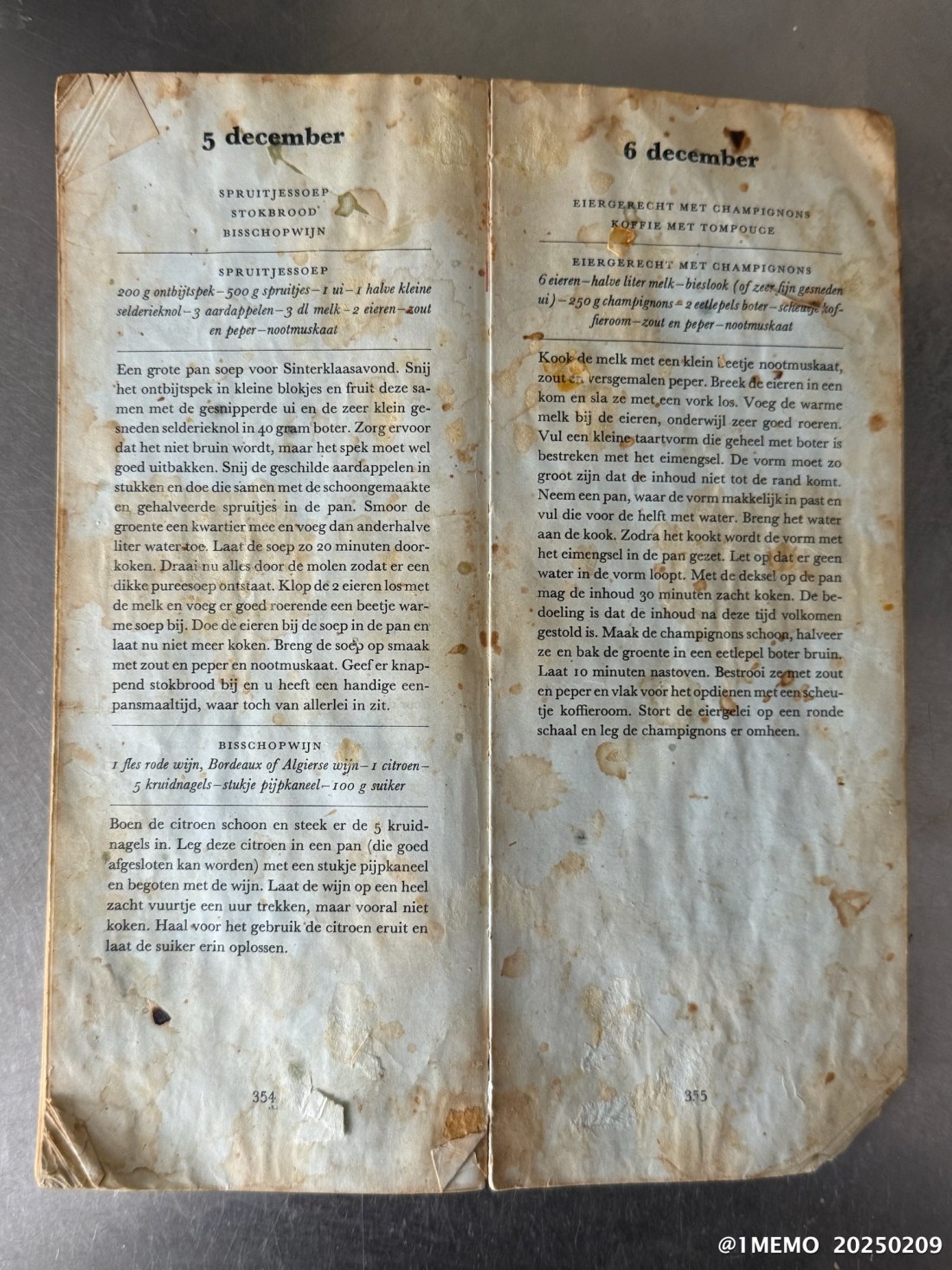 ‘Spruitjessoep’ , dutch Brussels sprout soup, in the Daily Cookbook (Dagkookboek by Marianne Stuit) I bought new — two copies for both me and my friend — in 1971-2. I was living in Oegstgeest, Holland, near Leiden, as a student Biology (Biochemistry) at the Leiden University. I vividly remember, sliding across the floor (with a sprained ankle) between my tiny kitchen and student room – in the attic of my landlady’s house – with a large enamel pot of Brussels sprout soup.