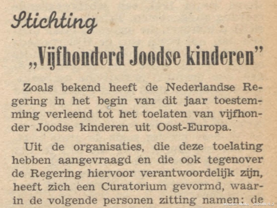 2. Stichting “Vijfhonderd Joodse kinderen” (Clip). Miracles•Media • 20250819_2 | Source : Nieuw Israelietisch Weekblad, April 11, 1947 / Delpher URL https://resolver.kb.nl/resolve?urn=ddd:010873407:mpeg21:a0020