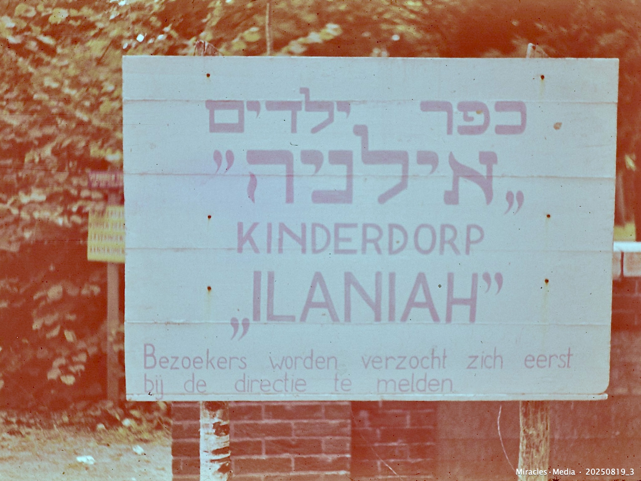 3. Sign in both Hebrew and Dutch at the entrance to Children’s Village Ilaniah in Apeldoorn, ca 1948. Miracles•Media • 20250819_3 | Source : United States Holocaust Memorial Museum, courtesy of Elinor Rosenstein Gabriel