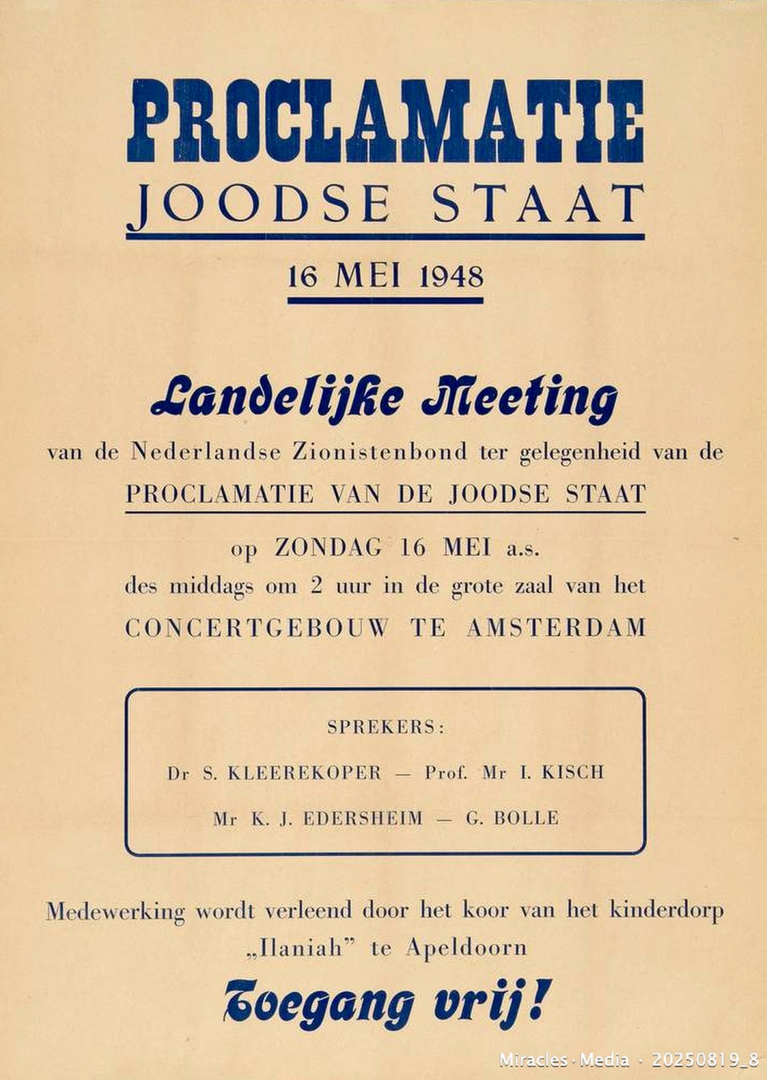On the occasion of the proclamation of the State of Israel on May 14, 1948, the Dutch Zionist League organized a national meeting on May 16, 1948 in the Amsterdam Concertgebouw, with a performance by the choir of the Children’s Village “Ilaniah”.