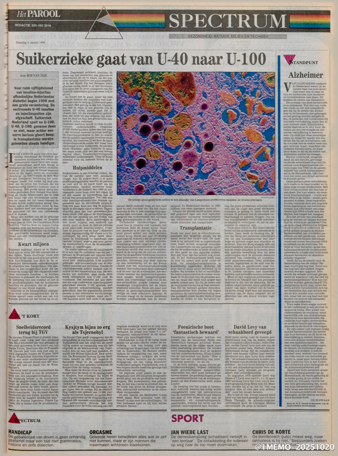 Big surprise today , to encounter this nice news article by journalist Rob van Dijk reporting on our pancreatic islet transplantation breakthrough in the Leiden University Hospital (now LUMC) in the Amsterdam based Dutch national newspaper Parool , Saturday 6 January 1990 (1).