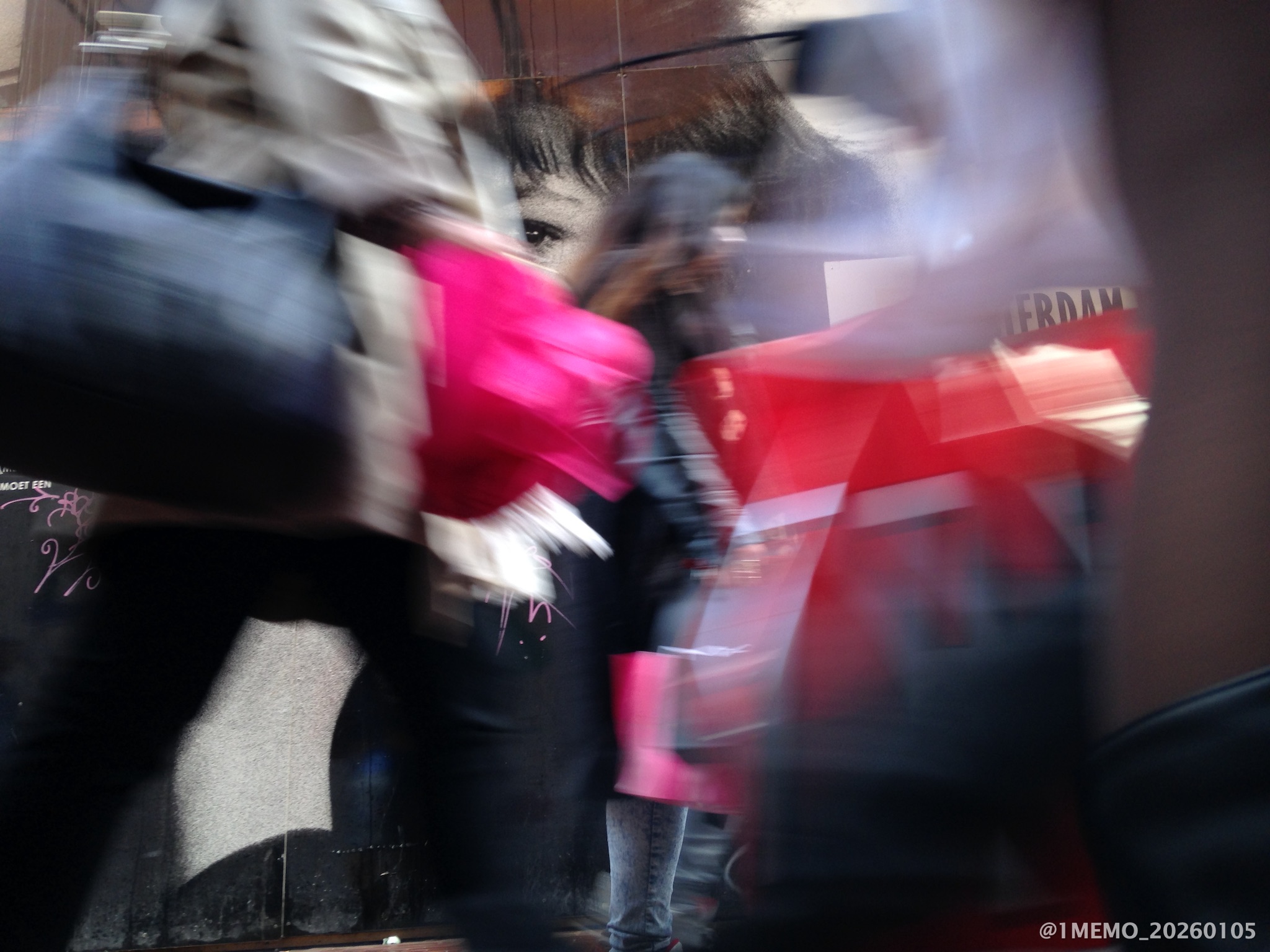 Passersby in front of Ed van der Elsken’s photo’s outside in the Nieuwendijk street in Amsterdam during photo expo : Amsterdam! Ed van der Elsken by Stadsarchief , August 2014.