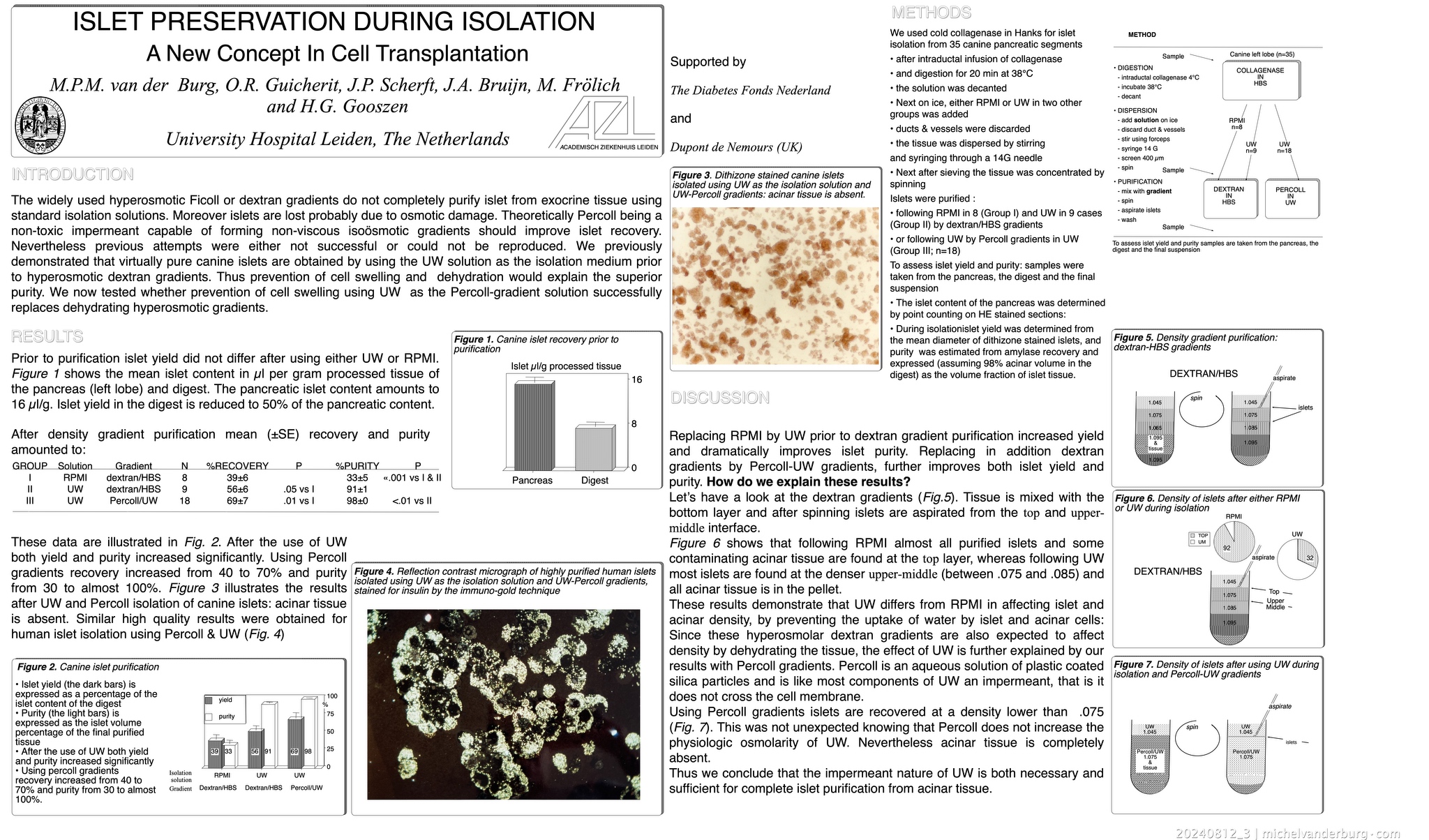 3. Paper (Notes 2) included as Chapter 3 in my doctoral thesis (Leiden University, November 1994) : Assessment of islet isolation efficacy in dogs. In : Van der Burg MPM. Pancreatic islet transplantation: studies on the technique and efficacy of islet isolation and transplantation ( Chapter 3). (Doctoral Thesis, Leiden University, 1994), Paperback (1994, Nov 9) Boskoop: Van der Burg (ISBN 9080216410); E-book (2022, Oct 25) Boskoop: Michel van der Burg | Miracles•Media ( ISBN 9789080216402). Retrieved (Nov 24th, 2025) from Leiden University Scholarly Publications, Persistent URL https://hdl.handle.net/1887/3486604 . Direct link to file Chapter 3 , URL https://scholarlypublications.universiteitleiden.nl/access/item%3A3486610/view