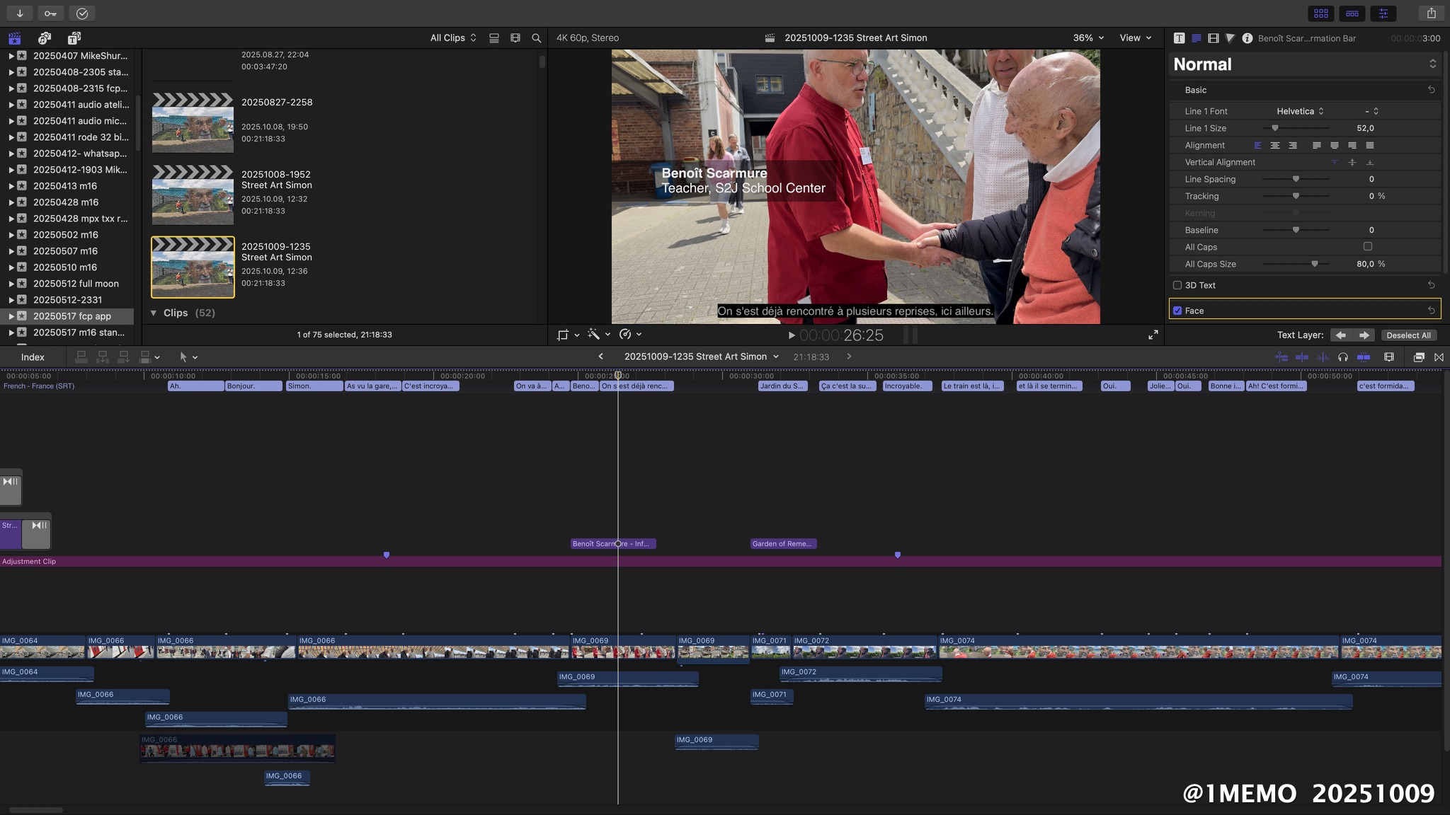 Finished the french audio transcript , now final phase of Street Art Simon’s documentary – captions with transcript, translation, (inter)titles , credits – in Final Cut Pro.