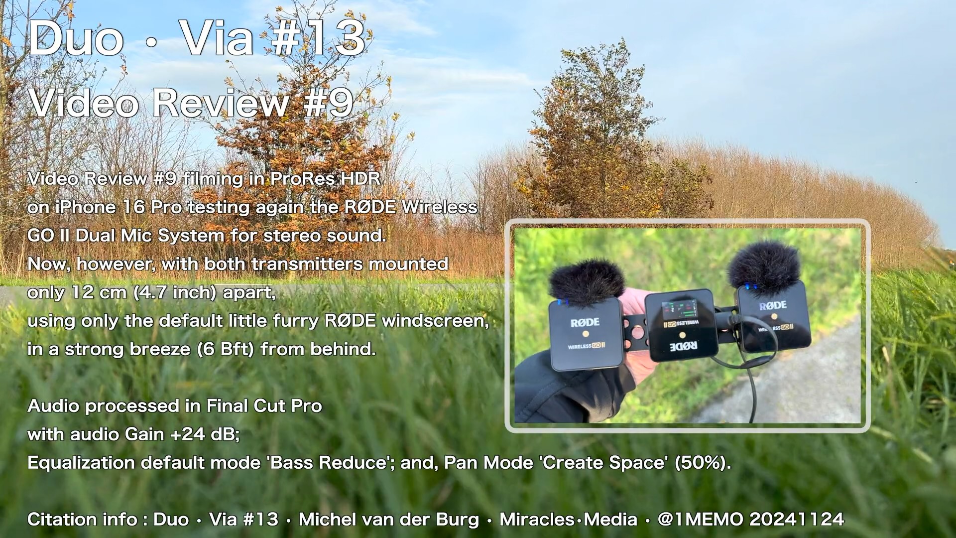 Video Review #9 filmed in ProRes HDR on iPhone 16 Pro testing again the RØDE Wireless GO II Dual Mic System for stereo sound, now, however, with both transmitters mounted only 12 cm (4.7 inch) apart (more tomorrow on this in Review #10), and using only the default little furry RØDE windscreen.