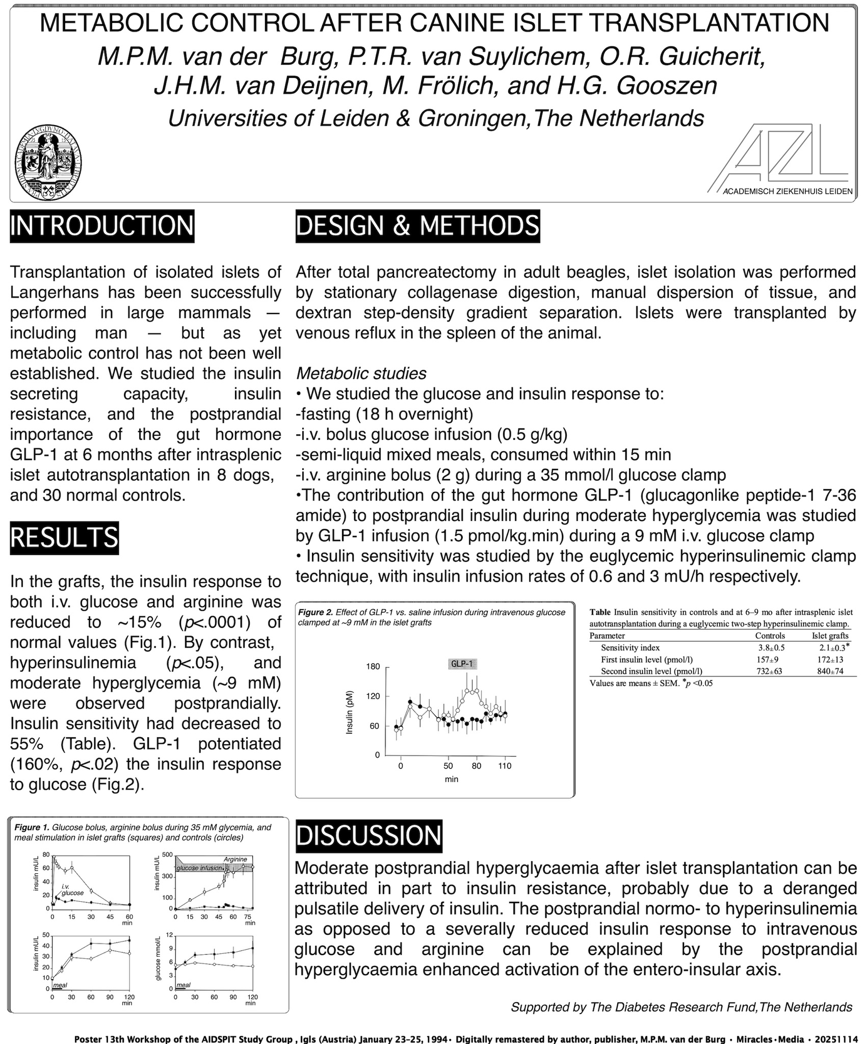 3. Metabolic control after canine islet transplantation. M.P.M. van der Burg, P.T.R. van Suylichem, O.R. Guicherit, J.H.M. van Deijnen, M. Frölich, and H.G. Gooszen (Universities of Leiden & Groningen, The Netherlands). Poster presented at the 13th Workshop of the AIDSPIT Study Group , Igls, Austria, January 23–25, 1994 • In : GLP-1 blood sugar regulation in islet transplants • AIDSPIT 1994 • Michel van der Burg • Miracles.Media • @1MEMO 20251114 • TakeNode 810cc881-d084-4d2e-b252-d432918b1946 • URL https://michelvanderburg.com/2025/11/14