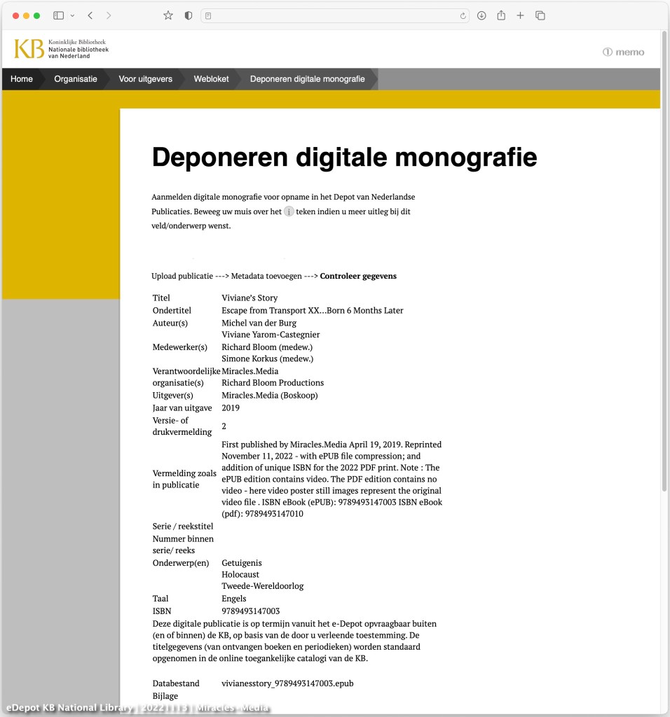 Viviane’s Story eBook ePub edition (ISBN 9789493147003) deposit today at the KB National Library of the Netherlands – eDepot port collecting digital publications from dutch publishers. Yesterday the pdf edition , now the ePub edition is also archived — with permission to lend the book outside the library. Link https://www.kb.nl/en/about-us/our-story