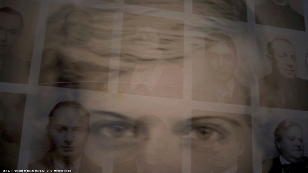 Note that this movie originally started as pure registration – in a few ‘long takes’ – of these quite overwhelming visual impressions from my first encounter with this installation (not yet aware actually of the factual history of these portraits). Only the next day, after completing the capturing of 4 long takes while walking back and forth the rows of portraits – did I read the caption halfway the installation, and first became aware of the background, more or less: that is, the history and ‘identity’ of the portraits and this ‘transport’. This prompted the idea for this visual account with the superimposed montage of the imagery of two of the takes, combined with the ambient sound (with of the lowest levels of wind noise) of a third take.