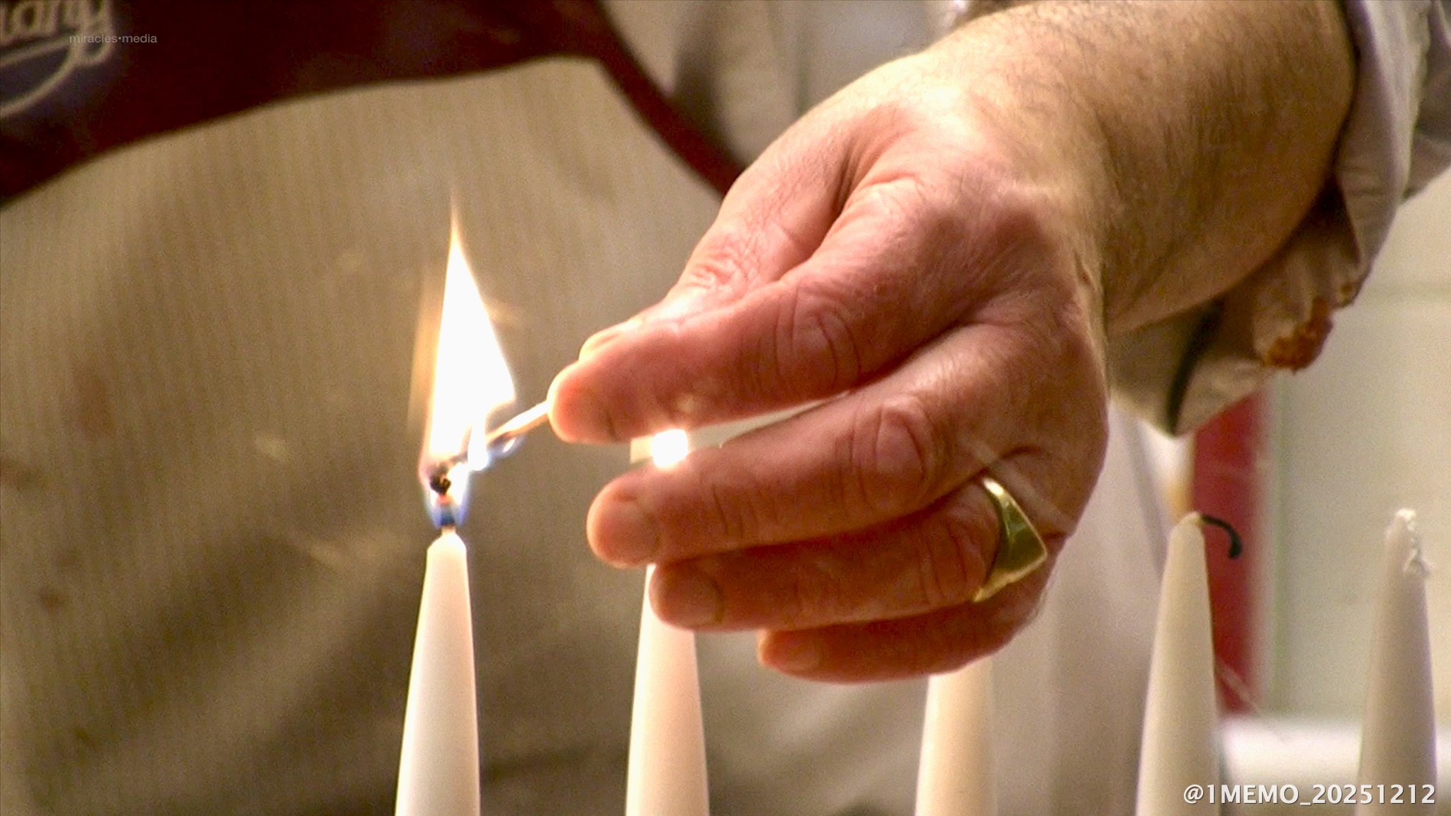 Guild butcher Van Sprang lights the candles in his shop in the historic town center of Gouda at the start of the traditional december event of Gouda by Candlelight (video frame).