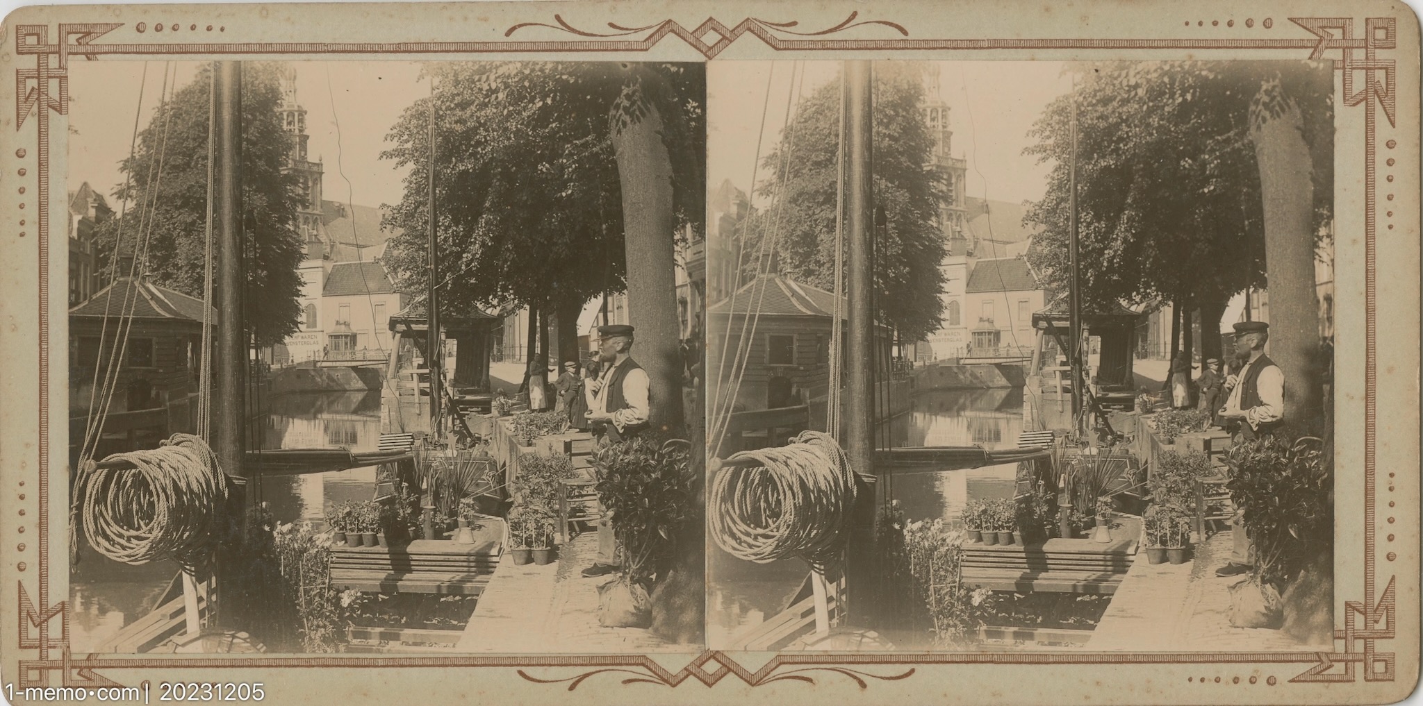 EN – Stereo image ca 1900 of plants and flower market from ship in the Gouwe river near the Fish Market (Vismarkt) in Gouda.