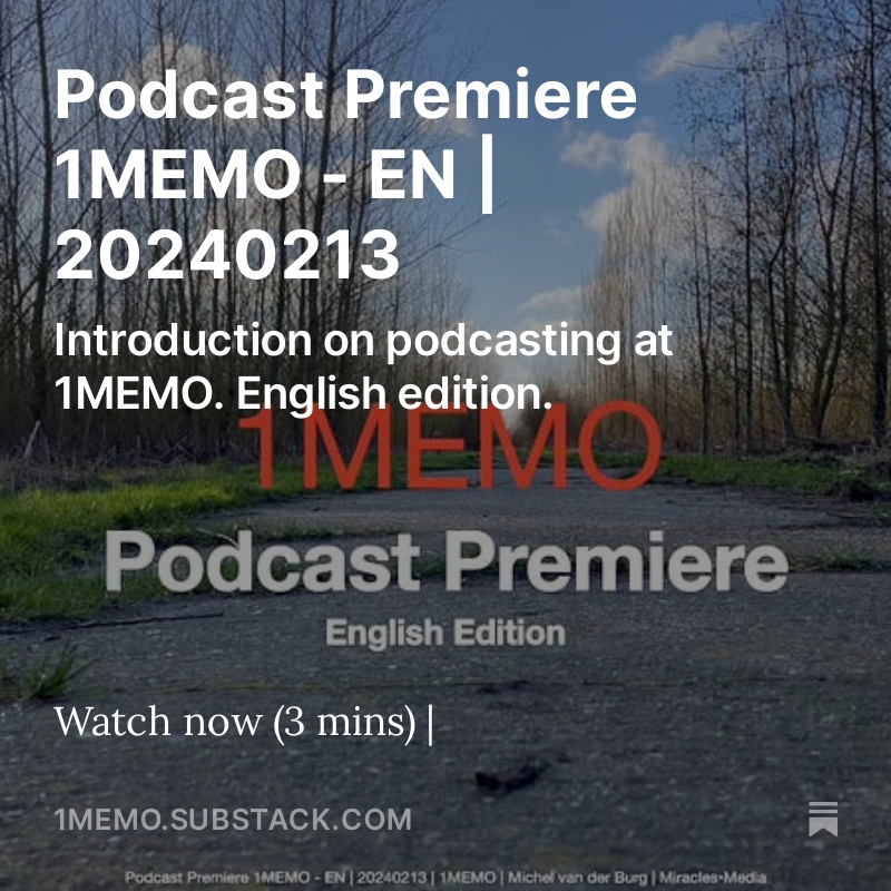 Citation info : Podcast Premiere 1MEMO – EN | 20240213 | 1MEMO | Michel van der Burg | Miracles•Media | URL https://1memo.substack.com | TakeNode ddb6c544-bb38-4c4f-a208-9e4b21ba725c