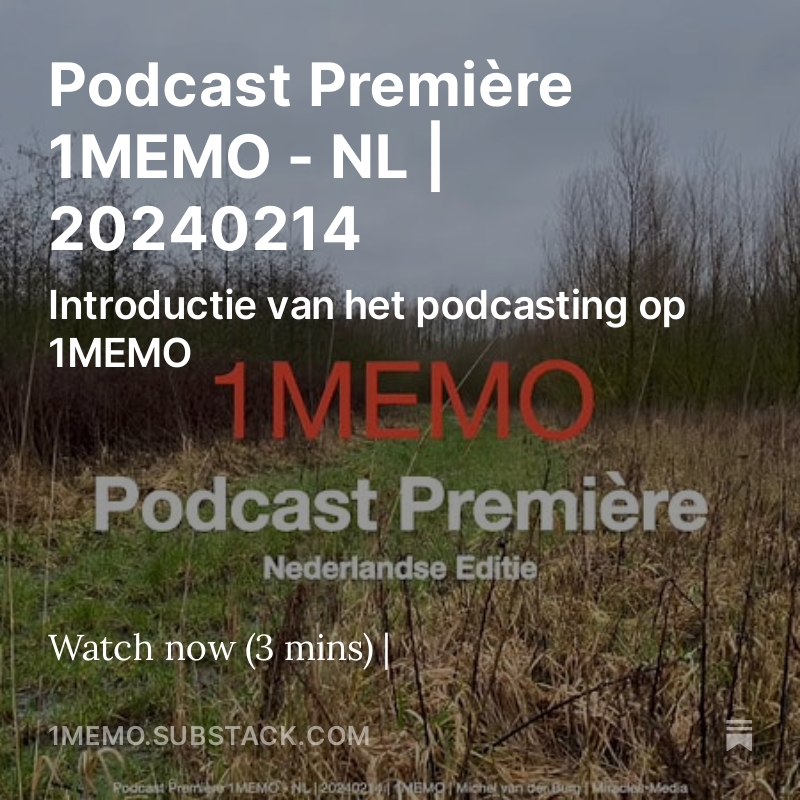 NL (dutch) – Podcast Première 1MEMO – Nederlandse editie. Introductie van het podcasting op 1MEMO. Publicatie op 1memo•substack•com is inclusief video. Gisteren (20240213) werd de Engelse editie (NL) geplaatst.