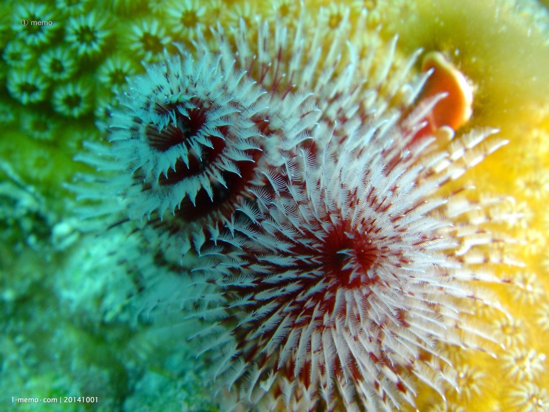 Flying Filmmaker | 20141001 | 1-memo.com | Diving image of Christmas tree tube worm (Spirobranchus Giganteus – NL Spiraal Kokerworm) underwater Caribbean Sea – Bonaire (Netherlands), 2004. Flying start of making video in 2004 using ultrathin Sony DSC-T1 .