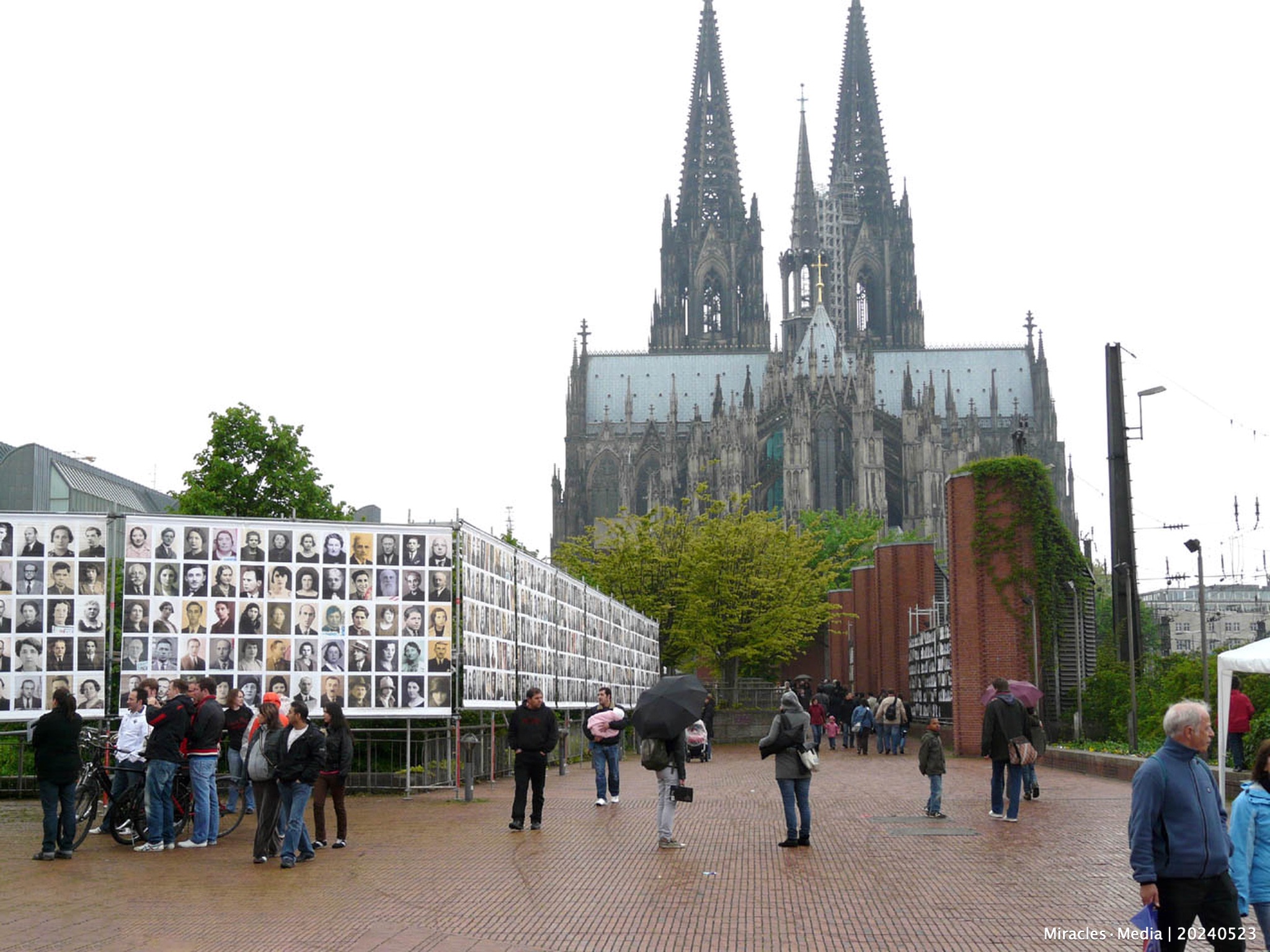 From May 8th to May 24th, 2010, the memorial installation “Open Memory” was on display in a prominent location in Köln (Cologne, Germany) — in front of the Hohenzollern Bridge, at the left bank of the Rhine river, parallel to the railway tracks of the Cologne Central Station (Köln Hauptbahnhof), with the Cologne Cathedral (Kölner Dom) in the background.