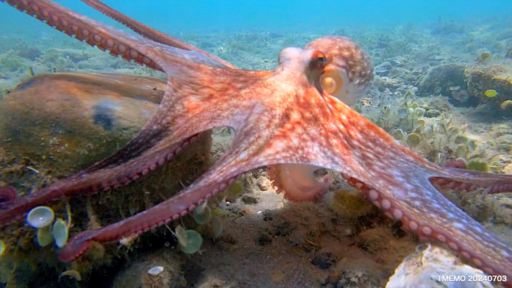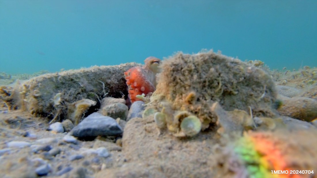 Another octopus encounter – a young one – this year underwater in the Corfu Channel – between the Adriatic Sea and the Ionian Sea , an embayment of the Mediterranean Sea – Corfu, Ionian Islands, Greece, June 2024.