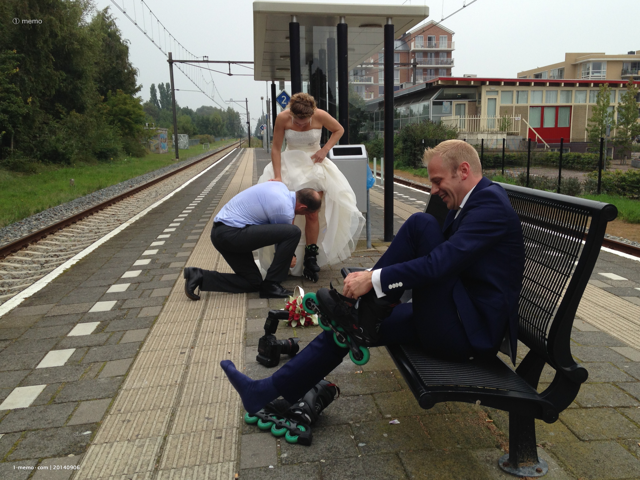 TAGS #michelvanderburg #1Memo #Holland #wedding #dress #bride #groom #skate #dogsbody #photographer #couple #station #railway #Zoetermeer