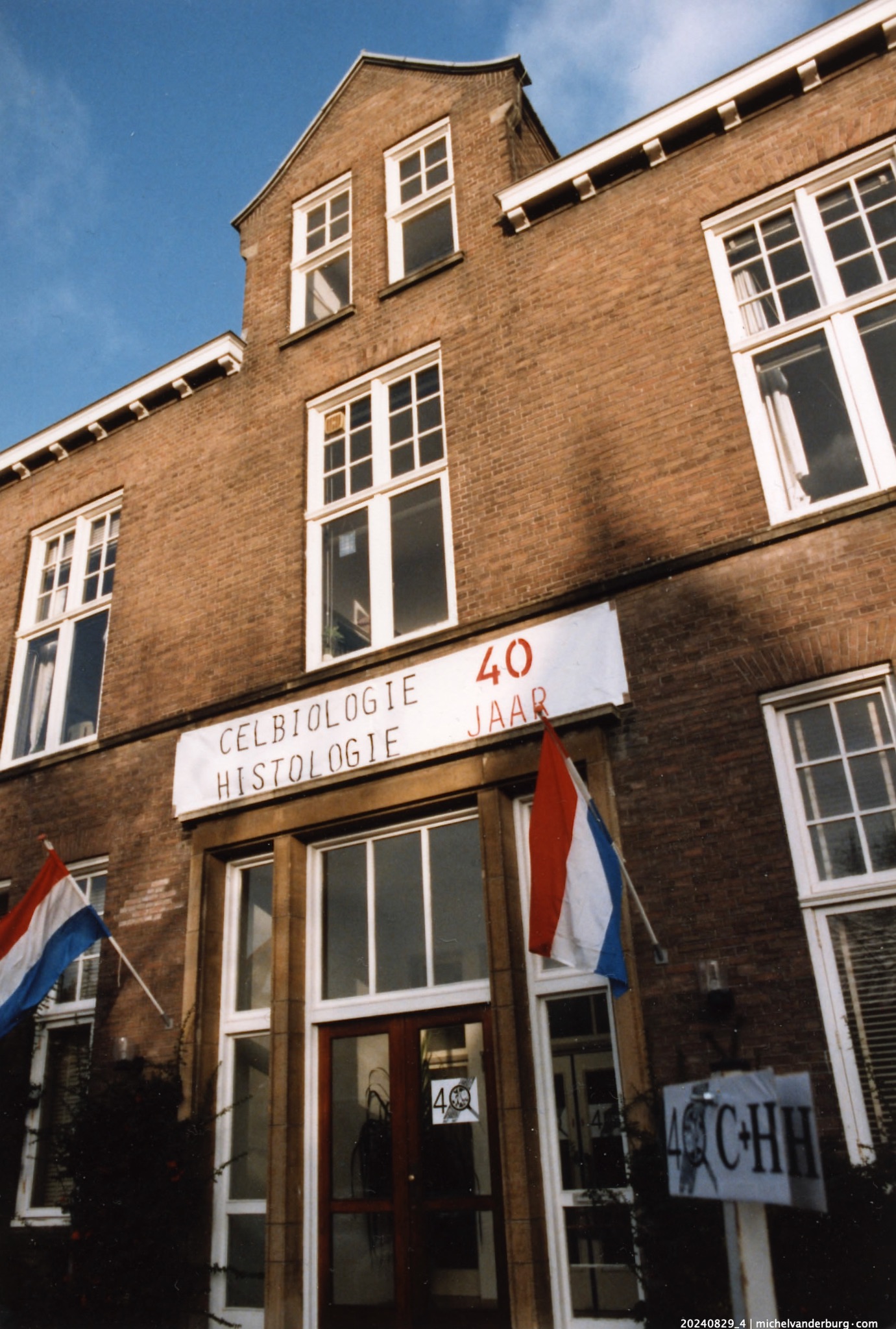 The 40th anniversary of the Cell Biology Department was celebrated 13-14 November 1987 (with a banner and flags at the entrance of the building (Image 20240829_4) , with the science meeting Nov. 13th and a get-together with (former) co-workers, including Professor emiritus Pieter J. Gaillard, dutch pioneer of tissue culture and transplantation, and founder of the laboratory when appointed professor of Experimental Histology at the Leiden University, Friday, November 14, 1947 (8,9).