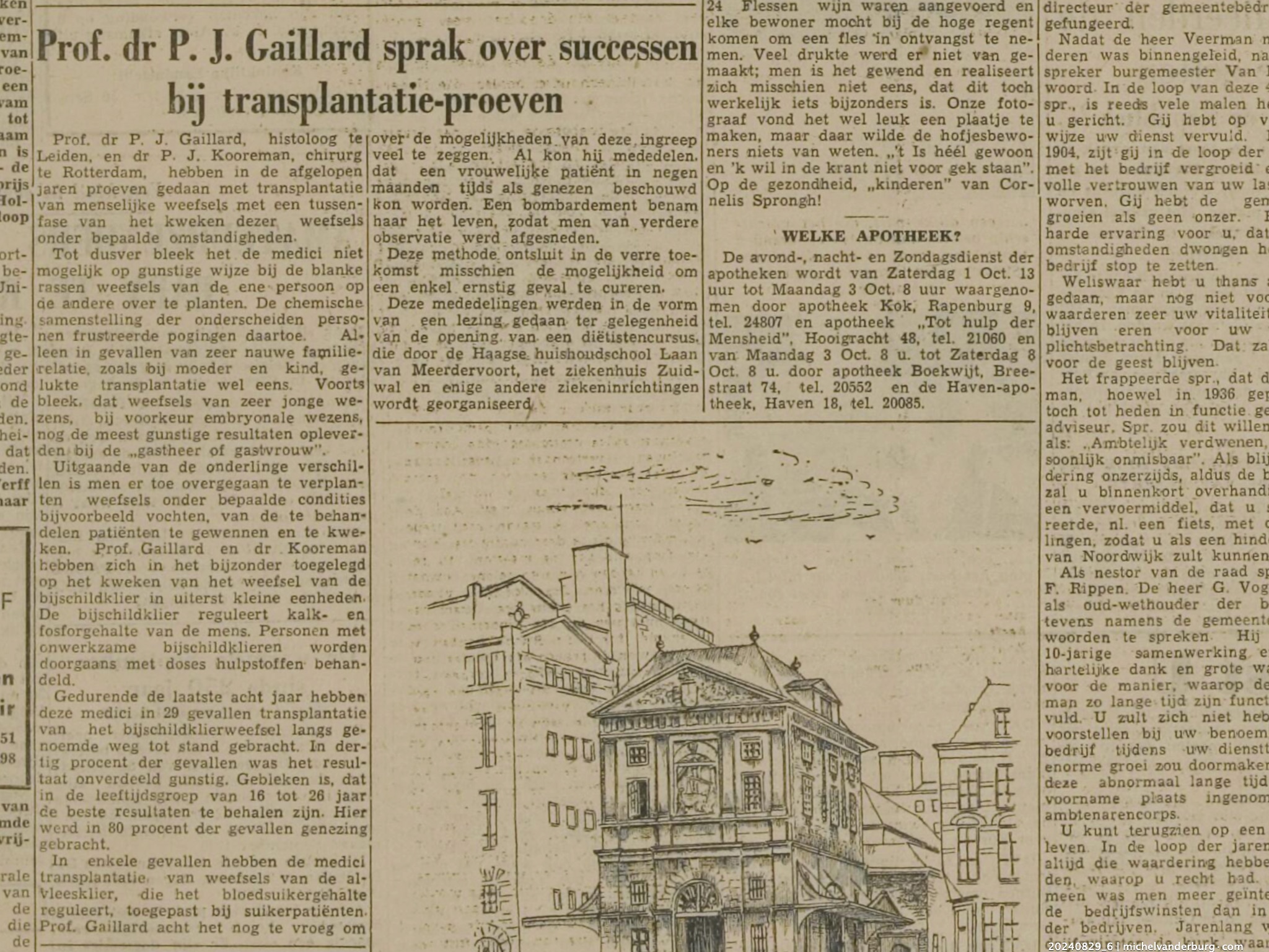 Prof. Dr. P.J. Gaillard spoke about successes in transplant trials. Nieuwe Leidsche Courant, Oct. 1, 1949 • 20240829_6 • michelvanderburg•com • TakeNode c5be6800-f3da-453e-9d40-d8fafffd27aa