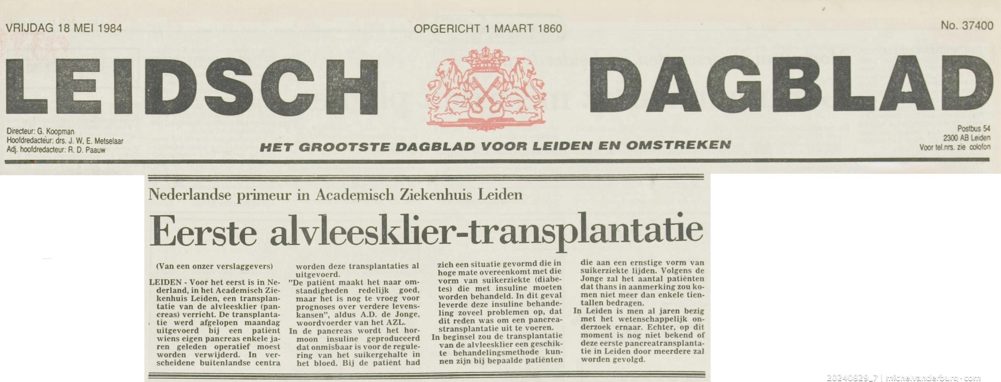 Eerste alvleesklier-transplantatie | Nederlandse primeur in Academisch Ziekenhuis Leiden. Leidsch Dagblad, May 18, 1984 (leiden.courant.nu) • 20240829_7 • michelvanderburg•com • TakeNode 5d3c88a5-4c67-48fd-8a8c-8165a5c2edfe